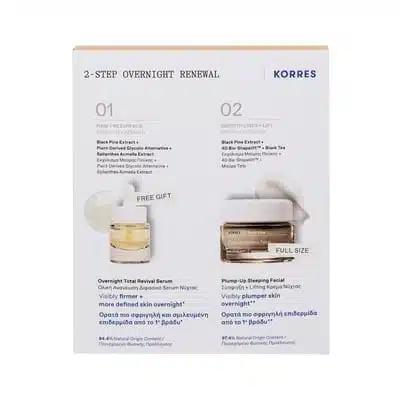 Τhe Black Pine 2-Step Overnight Renewal set contains: Black Pine Plump-Up Sleeping Facial Night Cream 40ml + GIFT Black Pine Overnight Total Revival Serum 15ml