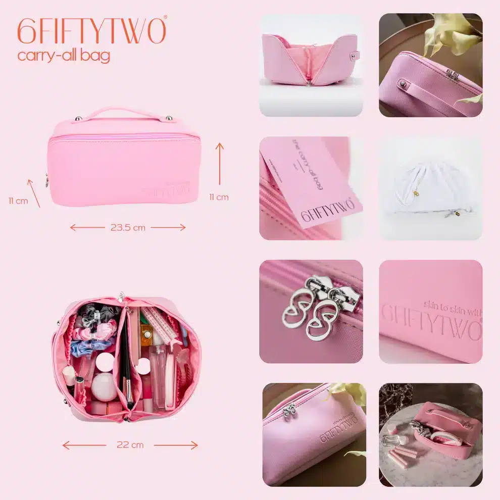 the 6FIFTYTWO® carry-all bag also comes with a double-lined velvet 6FIFTYTWO® dust bag, adding a touch of luxury to your storage experience. whether you’re using it for everyday outings or as a travel companion, this small but mighty carry-all fits more than you’d expect while keeping your items organized and your countertop clutter-free.