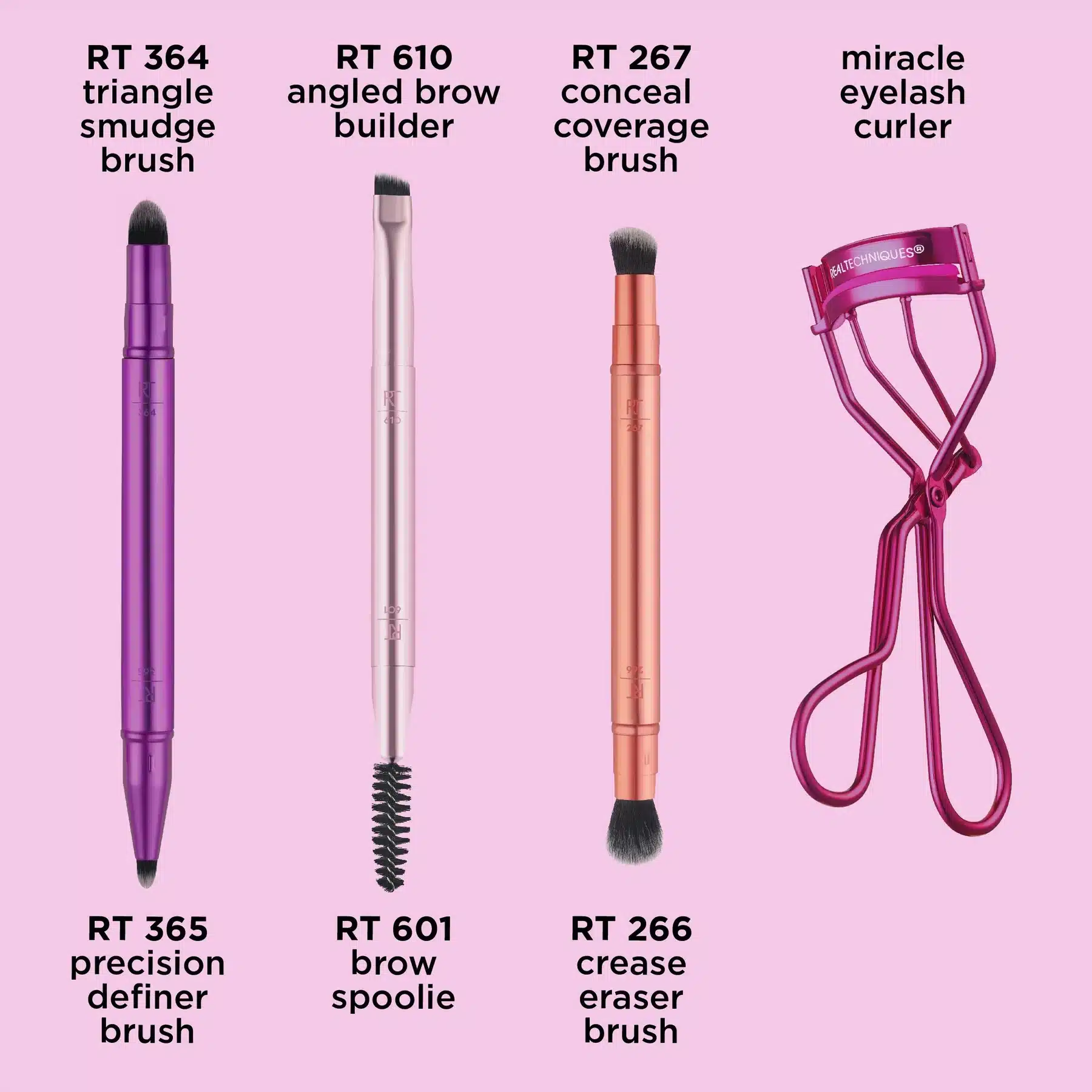 The Real Techniques Double Time Brush + Lash Set is the perfect travel set for your next get away. This set features 3 dual-ended makeup brushes for multi-tasking and an eyelash curler for lifted lashes. Each brush includes travel caps for mess-free, easy storage. The makeup brush set includes the 364 Triangle Smudge Brush + 365 Precision Definer Brush, 610 Angled Brow Builder + 601 Brow Spoolie, 266 Crease Eraser Brush + 267 Conceal Coverage Brush, and our Miracle Eyelash Curler. The brushes can be used with liquid, cream, and powder makeup such as eyeshadow, brow gel, brow pomade, eyeliner, and concealer. Our lash curler provides a gentle, natural-looking lash lift as the final touch to your routine. The Double Time brushes are easy to clean using our Real Techniques Brush + Sponge Cleansing Gel. They’re also 100% cruelty-free and made with UltraPlush synthetic bristles.