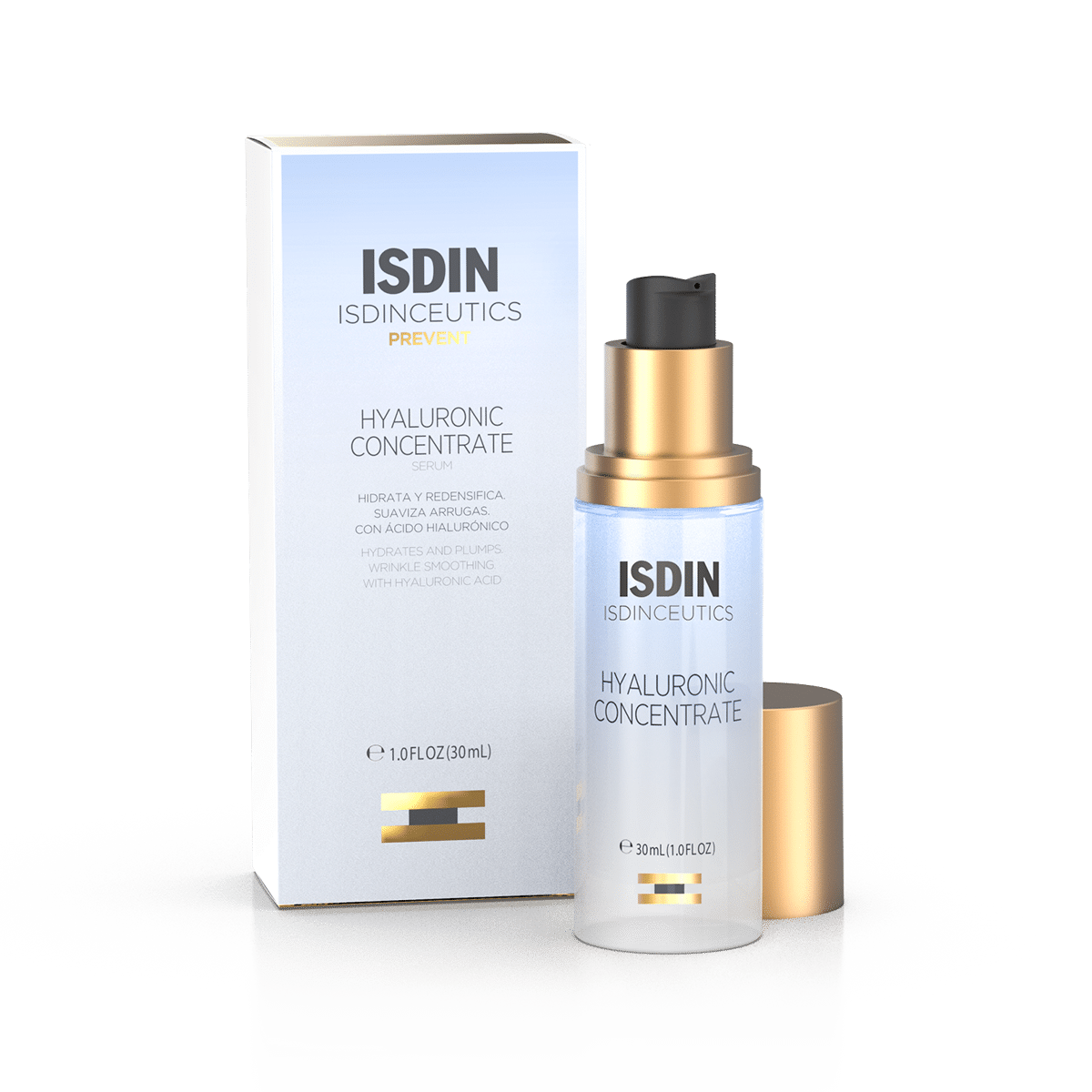Continue with the ISDIN Hyaluronic Concentrate, a lightweight serum infused with multi-molecular hyaluronic acid. This powerful concentrate delivers deep and long-lasting hydration, smooths fine lines, improves elasticity and enhances the skin’s natural glow.