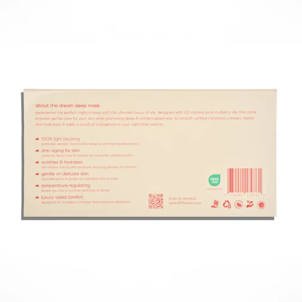 the dream sleep mask by 6FIFTYTWO®️ is your nightly invitation to luxury, crafted from 22 momme pure mulberry silk for a cloud-soft, skin-loving experience. hypoallergenic, ultra-breathable, and temperature regulating, this mask is designed to promote deep, uninterrupted sleep while caring for your skin. its smooth silk surface helps reduce creases, retain moisture, and prevent sleep lines, all while offering full light blocking for a truly restful slumber. sized for complete coverage and maximum comfort, it’s the perfect addition to your nighttime self-care ritual.