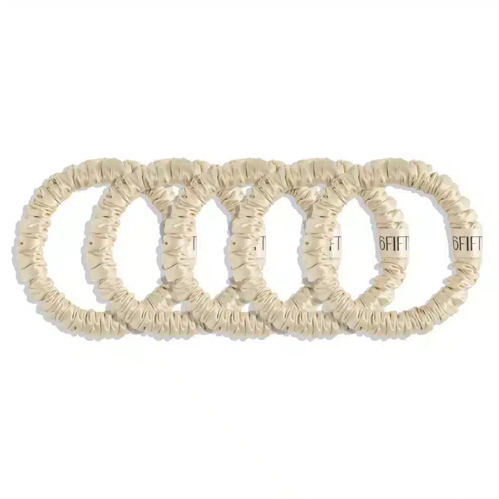 elevate your hair routine with the 6FIFTYTWO®️ set of 5 slim silk scrunchies, crafted to protect your hair while adding a touch of everyday luxury. made from 100% pure silk, these scrunchies are designed to minimise breakage, reduce creases, and glide smoothly through all hair types without pulling or snagging. lightweight, slim and refined, they’re perfect for creating effortless styles or wearing on your wrist as a subtle accessory. this curated set includes 5 scrunchies in one signature shade, ideal for those who love consistency, or prefer styling with more than one scrunchie at a time.